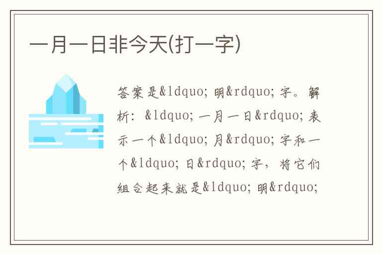 解析:“一月一日”表示一个“月”字和一个“日”字,将它们组合起来就是“明”字;“非今天”进一步提示不是“今”天,而是“明”天,也从侧面印证了谜底是“明”字。