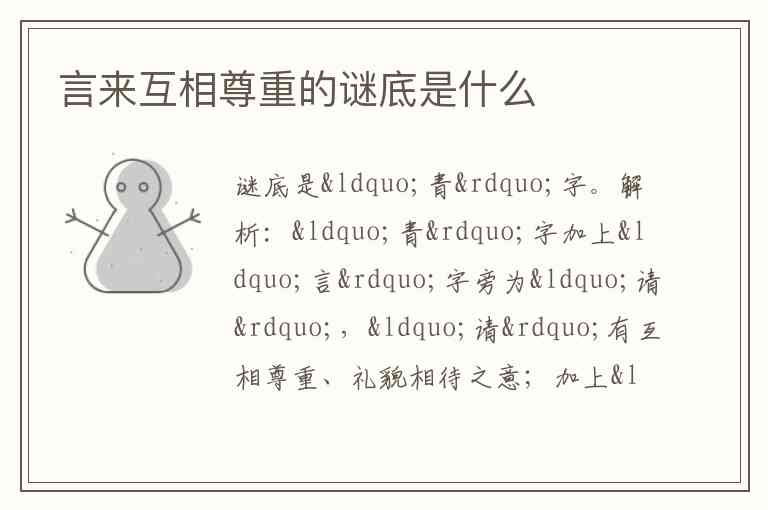 解析:“青”字加上“言”字旁为“请”,“请”有互相尊重、礼貌相待之意;加上“日”为“晴”,天气晴朗;加上“心”为“情”,情感丰富;加上“水”为“清”,清澈纯净 。所以根据谜面“言来互相尊重”等相关描述,谜底是“青”。