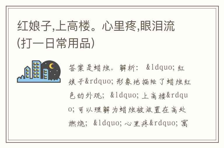 解析: “红娘子”形象地描绘了蜡烛红色的外观;“上高楼”可以理解为蜡烛被放置在高处燃烧;“心里疼”寓意蜡烛燃烧时蜡芯不断损耗,如同“心疼”;“眼泪流”则生动地表现出蜡烛燃烧时蜡油流淌,恰似流泪的样子 。所以这个日常用品是蜡烛。