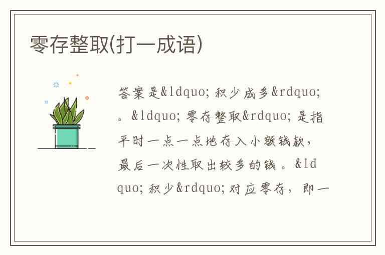 “零存整取”是指平时一点一点地存入小额钱款,最后一次性取出较多的钱 。“积少”对应零存,即一点点积累少量的金额;“成多”对应整取,把零散积累的小钱变成一笔较多的钱取出,所以谜底是“积少成多”这个成语。