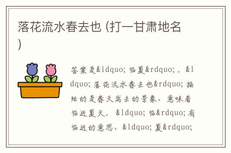 “落花流水春去也”描绘的是春天离去的景象,意味着临近夏天。 “临”有临近的意思,“夏”就是夏天,所以扣合甘肃地名“临夏” 。
