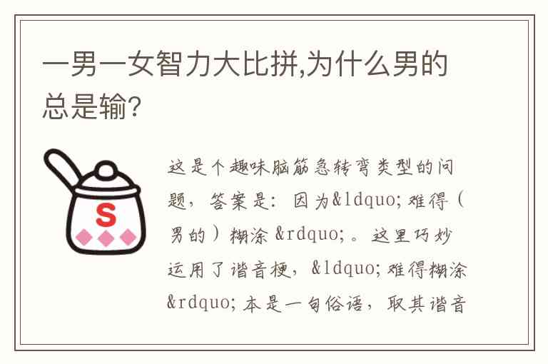 这是个趣味脑筋急转弯类型的问题,答案是:因为“难得(男的)糊涂 ”。这里巧妙运用了谐音梗,“难得糊涂”本是一句俗语,取其谐音理解为“男的糊涂” ,所以解释了为什么一男一女智力大比拼时男的总是输 。