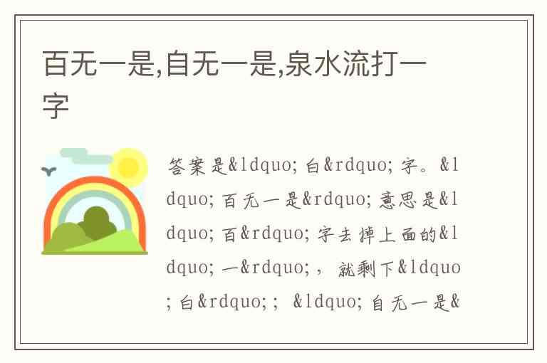 “百无一是”意思是“百”字去掉上面的“一”,就剩下“白”;“自无一是”同理,“自”字去掉里面的“一”,也是“白”;“泉水流”,“泉”字的“水(氵)”流走了,同样剩下“白”。所以综合来看,这个字就是“白”。