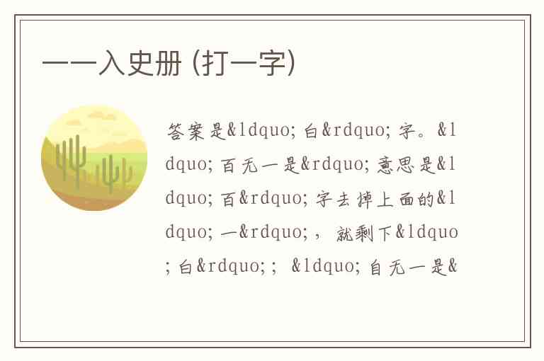 “百无一是”意思是“百”字去掉上面的“一”,就剩下“白”;“自无一是”同理,“自”字去掉里面的“一”,也是“白”;“泉水流”,“泉”字的“水(氵)”流走了,同样剩下“白”。所以综合来看,这个字就是“白”。