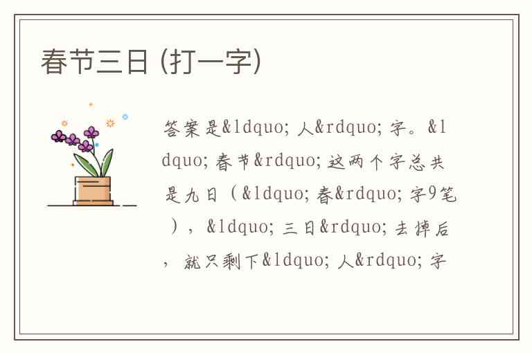 “春节”这两个字总共是九日(“春”字9笔 ),“三日”去掉后,就只剩下“人”字。