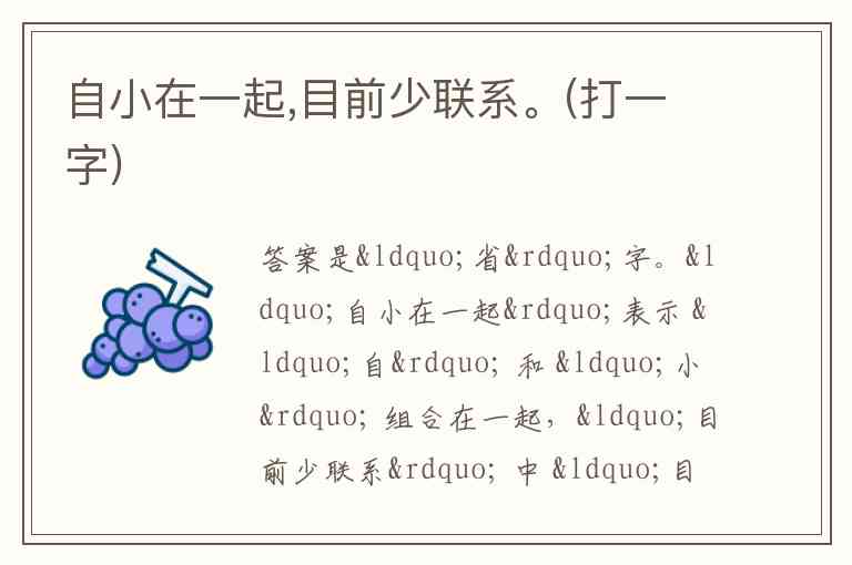 “自小在一起”表示 “自” 和 “小” 组合在一起,“目前少联系” 中 “目” 字的前面部分(即 “少” 字与之联系的部分)也是 “目” 字,这里取 “自” 字下面一半和 “小” 字组成 “少” ,再与 “目” 字合起来就是 “省” 字。