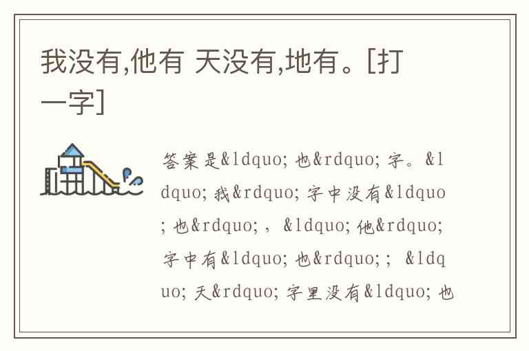 “我”字中没有“也”,“他”字中有“也”;“天”字里没有“也”,“地”字里包含“也” 。所以这个谜底是“也”字。