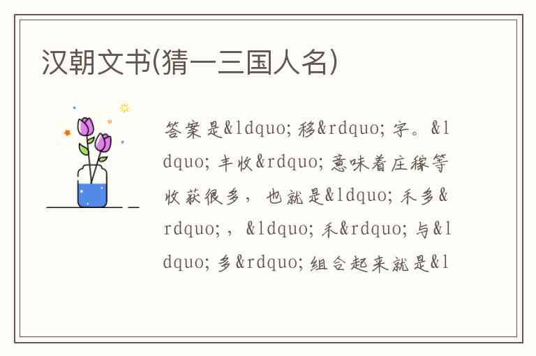 答案是“移”字。“丰收”意味着庄稼等收获很多,也就是“禾多”,“禾”与“多”组合起来就是“移”字。