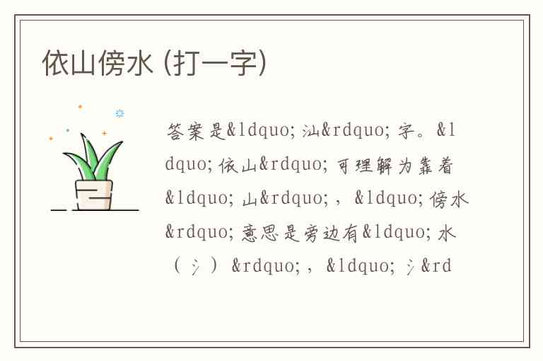 答案是“汕”字。“依山”可理解为靠着“山”,“傍水”意思是旁边有“水(氵) ”,“氵”与“山”组合起来就是“汕”字。