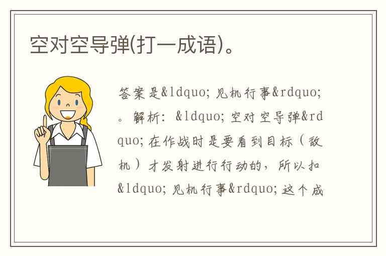 解析:“空对空导弹”在作战时是要看到目标(敌机)才发射进行行动的,所以扣“见机行事”这个成语,这里巧妙地将“机”理解为敌机,“行事”对应导弹发射攻击的行为 。
