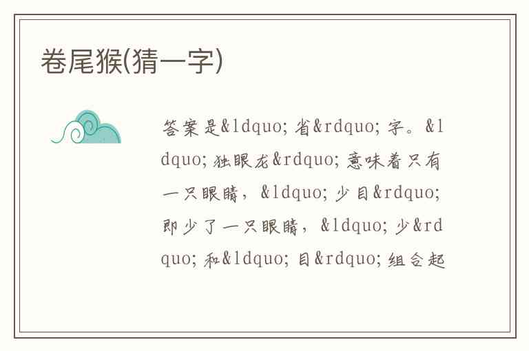 答案是“省”字。“独眼龙”意味着只有一只眼睛,“少目”即少了一只眼睛,“少”和“目”组合起来就是“省”字。
