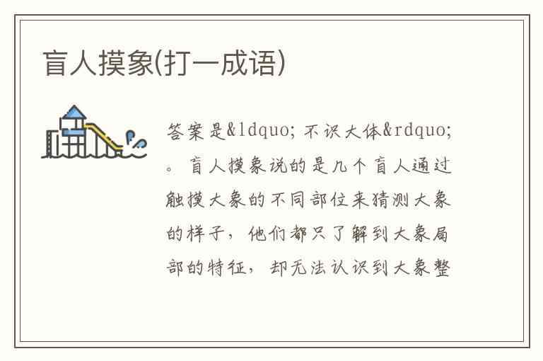 盲人摸象说的是几个盲人通过触摸大象的不同部位来猜测大象的样子,他们都只了解到大象局部的特征,却无法认识到大象整体的模样 ,这正符合“不识大体”这个成语所表达的不能认清事物的整体或全貌的意思。