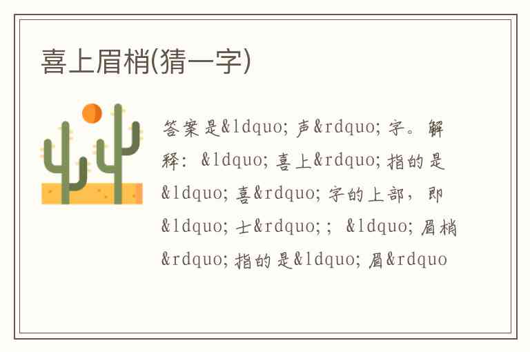 解释:“喜上”指的是“喜”字的上部,即“士”;“眉梢”指的是“眉”字的最上面部分,也就是“尸”。“士”与“尸”组合起来就是“声”字(这里是繁体的“声”,简体“声”也是同样的拆解思路推理而来 )。