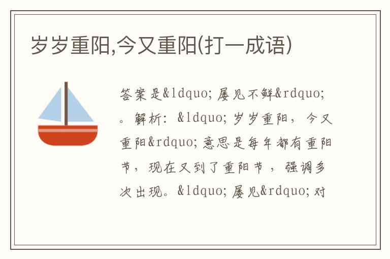 解析:“岁岁重阳,今又重阳”意思是每年都有重阳节,现在又到了重阳节 ,强调多次出现。“屡见”对应多次见到,扣合“岁岁”“今又”这种重复出现的情况;“不鲜”表示不新鲜,因为每年都有重阳,已经不是新鲜事了,所以扣合谜面,该成语为“屡见不鲜” 。