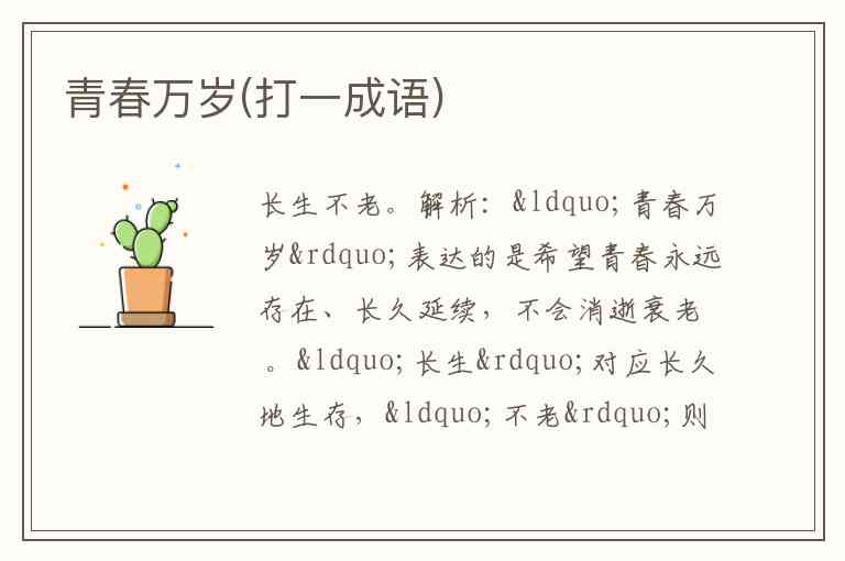 解析:“青春万岁”表达的是希望青春永远存在、长久延续,不会消逝衰老 。“长生”对应长久地生存,“不老”则直接契合了青春不衰老的含义,所以该谜面对应的成语是“长生不老”。