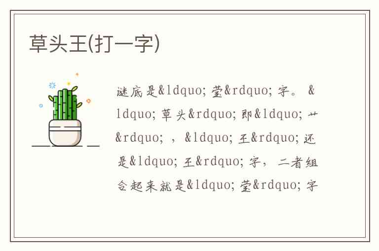 谜底是“莹”字。 “草头”即“艹” ,“王”还是“王”字,二者组合起来就是“莹”字。