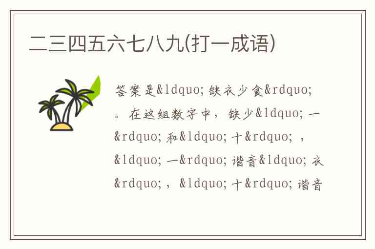 在这组数字中,缺少“一”和“十” ,“一”谐音“衣”,“十”谐音“食”,所以扣“缺衣少食”这个成语,常用来形容生活贫困,物资匮乏。