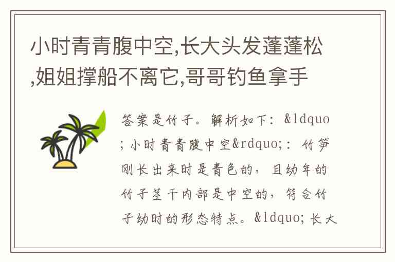 “哥哥钓鱼拿手中”:以前常见用竹子做成钓竿来钓鱼 。所以综合来看,谜底是竹子。