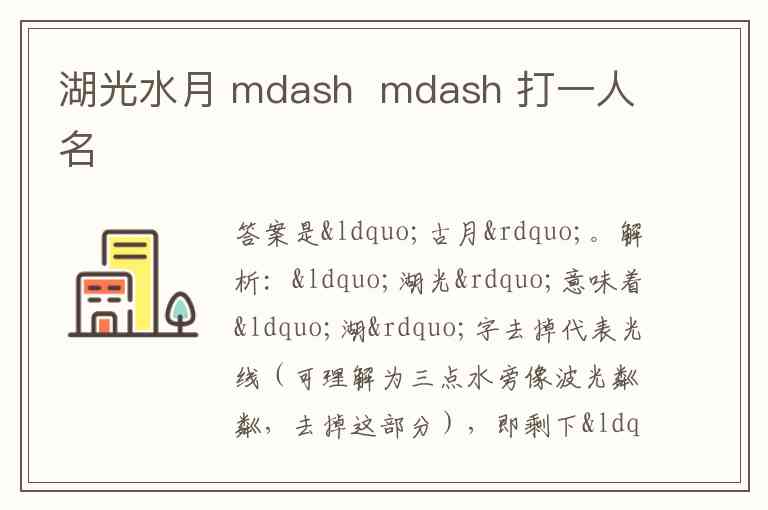 解析:“湖光”意味着“湖”字去掉代表光线(可理解为三点水旁像波光粼粼,去掉这部分),即剩下“胡”;“水月”表示“月”字不见了(水和月组合,把月去除),那么“胡”字去掉“月”就剩下“古月” 。