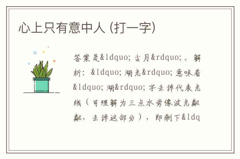 解析:“湖光”意味着“湖”字去掉代表光线(可理解为三点水旁像波光粼粼,去掉这部分),即剩下“胡”;“水月”表示“月”字不见了(水和月组合,把月去除),那么“胡”字去掉“月”就剩下“古月” 。