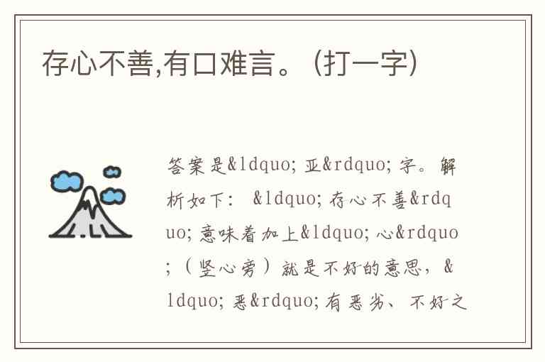 解析如下: “存心不善”意味着加上“心”(竖心旁)就是不好的意思,“恶”有恶劣、不好之意,“亚”加上竖心旁为“恶”;“有口难言”表示加上“口”却难以说出想说的话,“亚”加上“口”是“哑”,哑巴自然有口难言 。所以综合来看,这个字是“亚”。