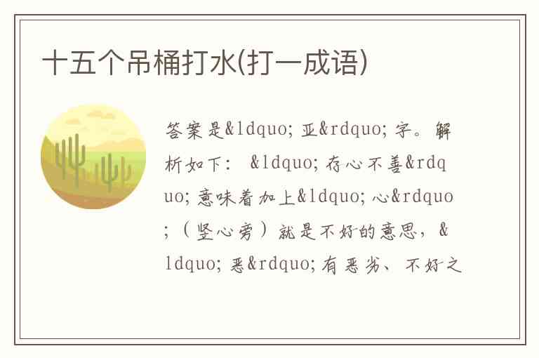 - 心理层面的延伸:这个谜语也巧妙地利用了“七上八下”形容心里不安的含义。十五个吊桶打水的混乱场面,让人联想到心里的忐忑和不安,就像这种混乱的局面让人心里也乱糟糟的。
