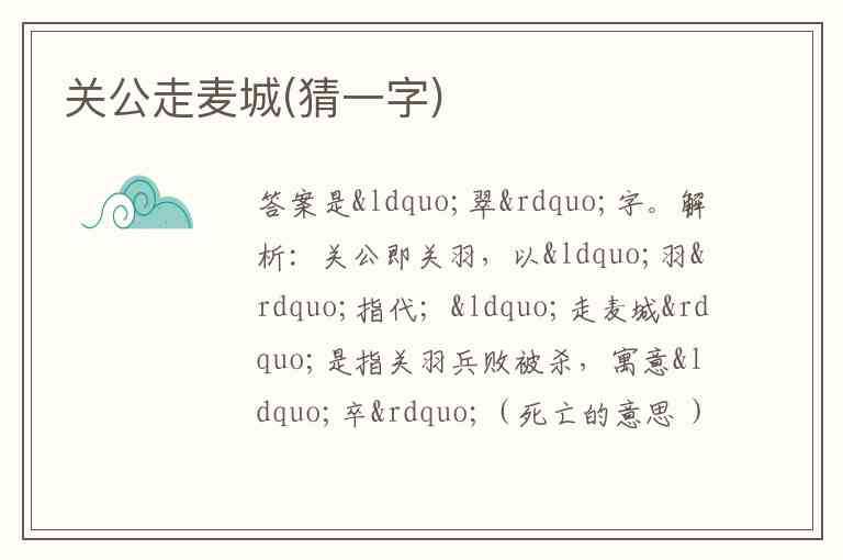 解析:关公即关羽,以“羽”指代;“走麦城”是指关羽兵败被杀,寓意“卒”(死亡的意思 )。“羽”和“卒”组合起来就是“翠”字。