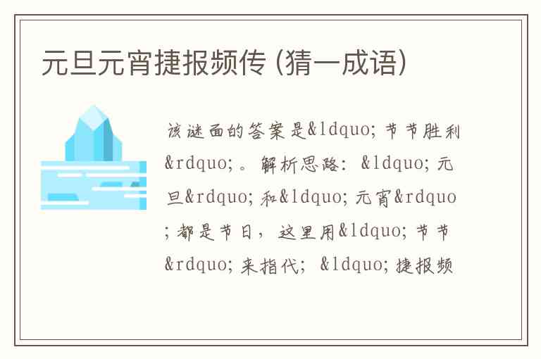 解析思路:“元旦”和“元宵”都是节日,这里用“节节”来指代;“捷报频传”通常表示不断传来胜利的消息,也就是“胜利”。所以整体扣合成语“节节胜利” 。