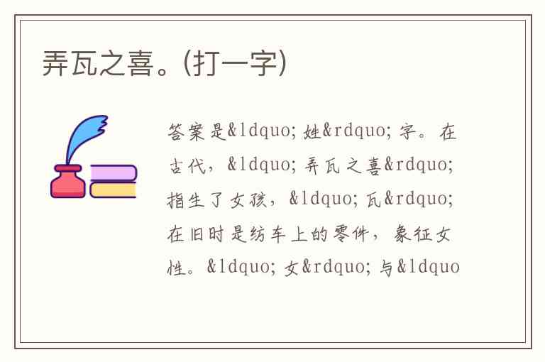 答案是“姓”字。在古代,“弄瓦之喜”指生了女孩,“瓦”在旧时是纺车上的零件,象征女性。“女”与“生”组合起来就是“姓”字。