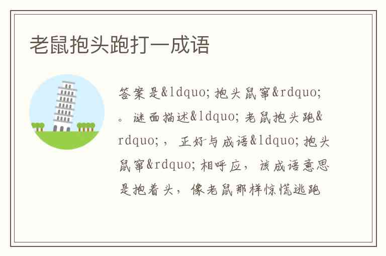 谜面描述“老鼠抱头跑”,正好与成语“抱头鼠窜”相呼应,该成语意思是抱着头,像老鼠那样惊慌逃跑,形容受到打击后狼狈逃跑的样子 。
