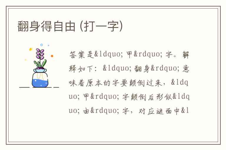 解释如下:“翻身”意味着原本的字要颠倒过来,“甲”字颠倒后形似“由”字,对应谜面中“翻身得自由(‘由’) ”,所以这个字是“甲” 。