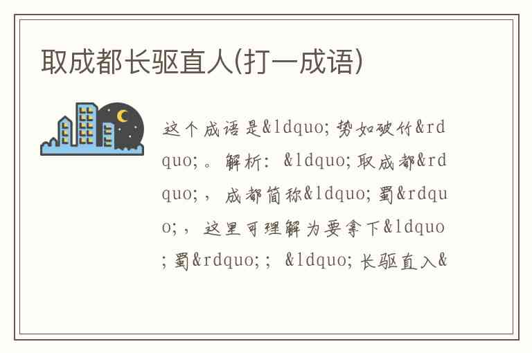 解析:“取成都”,成都简称“蜀”,这里可理解为要拿下“蜀”;“长驱直入”表示毫无阻碍地向前挺进,有一种强大的气势冲破阻拦。整体意思连贯起来就是以一种强大的态势突破“蜀”,所以扣“势如破竹” 。