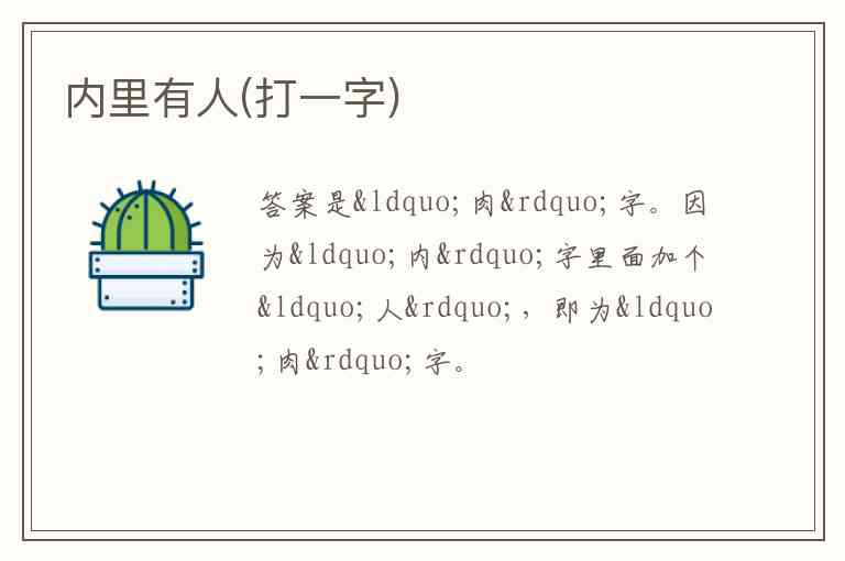 答案是“肉”字。因为“内”字里面加个“人”,即为“肉”字。