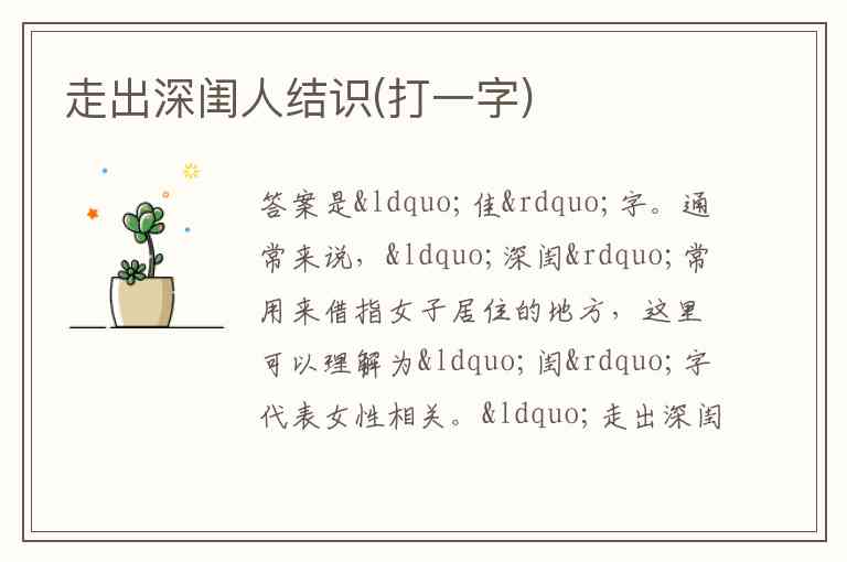通常来说,“深闺”常用来借指女子居住的地方,这里可以理解为“闺”字代表女性相关。“走出深闺”就是把“闺”字里的“女”去掉,剩下“圭”。“人结识”表示加上“人”(单人旁“亻” ),“亻”与“圭”组合起来就是“佳”字。