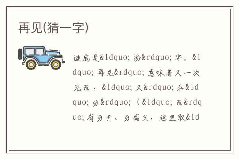 谜底是“扮”字。“再见”意味着又一次见面 ,“又”和“分”(“面”有分开、分离义,这里取“分”来辅助表意)组合起来就是“扮”字。