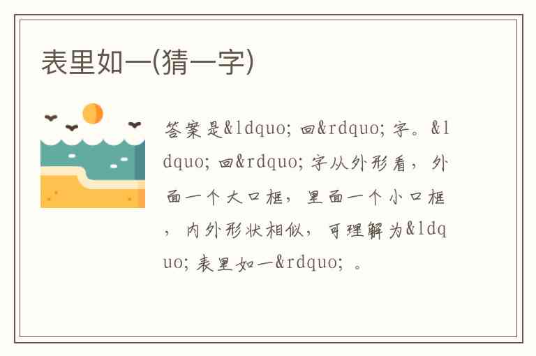 答案是“回”字。“回”字从外形看,外面一个大口框,里面一个小口框,内外形状相似,可理解为“表里如一” 。