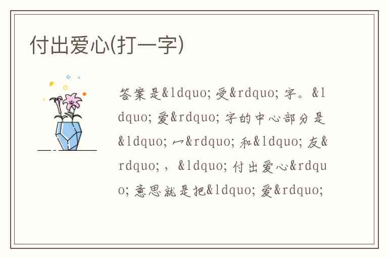 答案是“受”字。“爱”字的中心部分是“冖”和“友”,“付出爱心”意思就是把“爱”字中的“心”(即“冖”)去掉,剩下的部分与“友”组合起来就是“受”字。