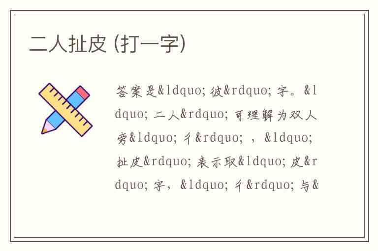 答案是“彼”字。“二人”可理解为双人旁“彳” ,“扯皮”表示取“皮”字,“彳”与“皮”组合起来就是“彼”字。
