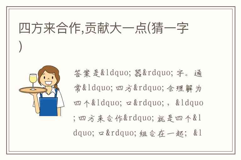 通常“四方”会理解为四个“口”,“四方来合作”就是四个“口”组合在一起;“贡献大一点”,这里“大”加上“一点”,可以看作是“犬”。四个“口”和“犬”组合起来,便是“器”字。