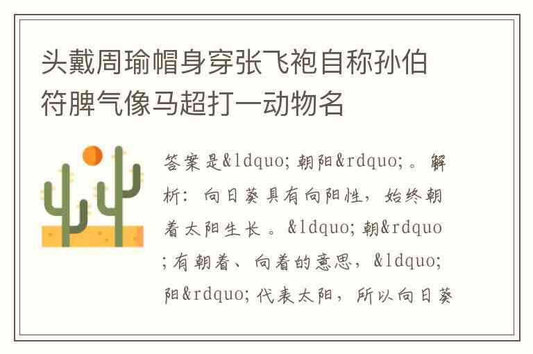 头戴周瑜帽身穿张飞袍自称孙伯符脾气像马超打一动物名