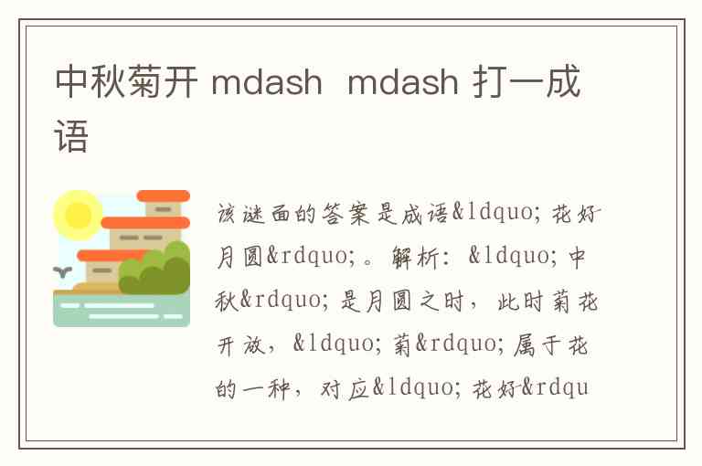 解析:“中秋”是月圆之时,此时菊花开放,“菊”属于花的一种,对应“花好”,“中秋”对应“月圆”,所以扣合成语“花好月圆” 。