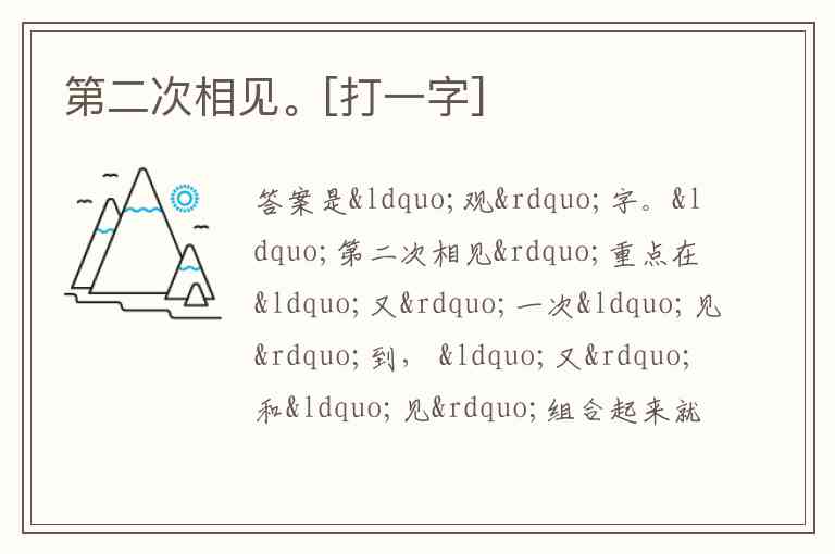 答案是“观”字。“第二次相见”重点在“又”一次“见”到, “又”和“见”组合起来就是“观”字。