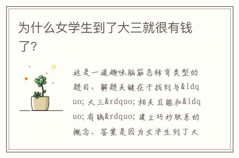 答案是因为女学生到了大三就会成为“大四(大款)”。这里利用了谐音梗,将“大四”巧妙地联想成“大款”,形象地解释了为什么说女学生到大三就很有钱了 。