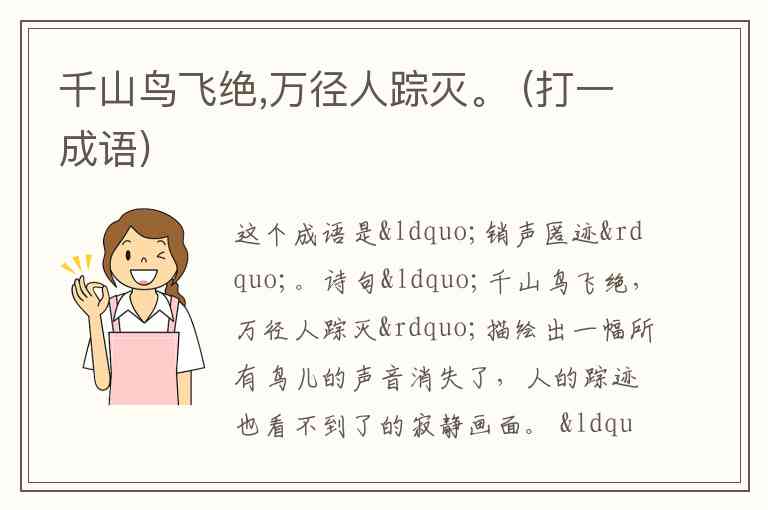诗句“千山鸟飞绝,万径人踪灭”描绘出一幅所有鸟儿的声音消失了,人的踪迹也看不到了的寂静画面。 “销声匿迹”中“销声”对应鸟儿声音消失,“匿迹”对应人的踪迹不见,所以谜底是“销声匿迹” 。