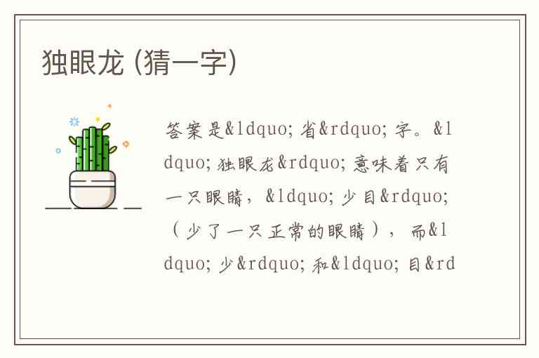 答案是“省”字。“独眼龙”意味着只有一只眼睛,“少目”(少了一只正常的眼睛),而“少”和“目”组合起来就是“省”字。