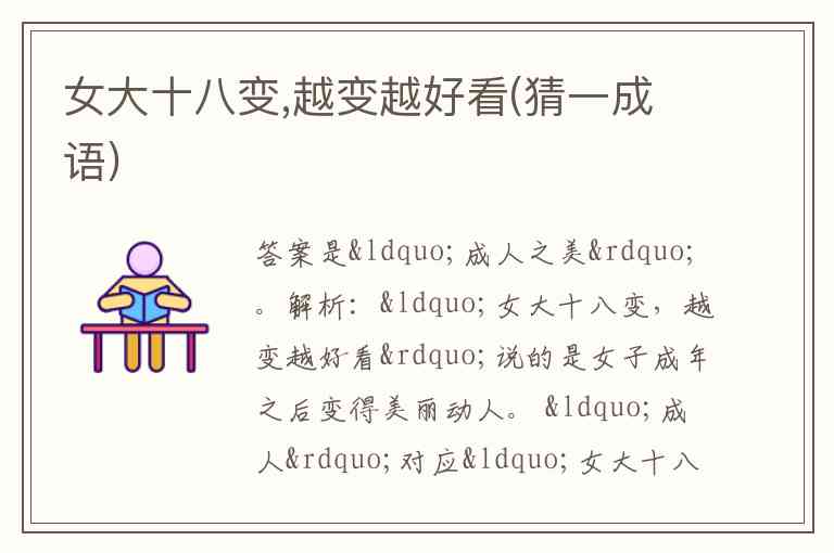 解析:“女大十八变,越变越好看”说的是女子成年之后变得美丽动人。 “成人”对应“女大十八变”,表示长大成人;“之美”对应“越变越好看”,突出变得美丽这一结果,所以扣“成人之美”这个成语 。