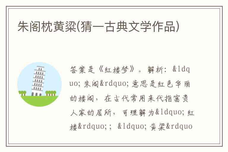 解析:“朱阁”意思是红色华丽的楼阁,在古代常用来代指富贵人家的居所,可理解为“红楼”;“黄粱”指代的是“黄粱一梦”,这里取“梦”之意。所以“朱阁枕黄粱”对应的古典文学作品就是《红楼梦》 。