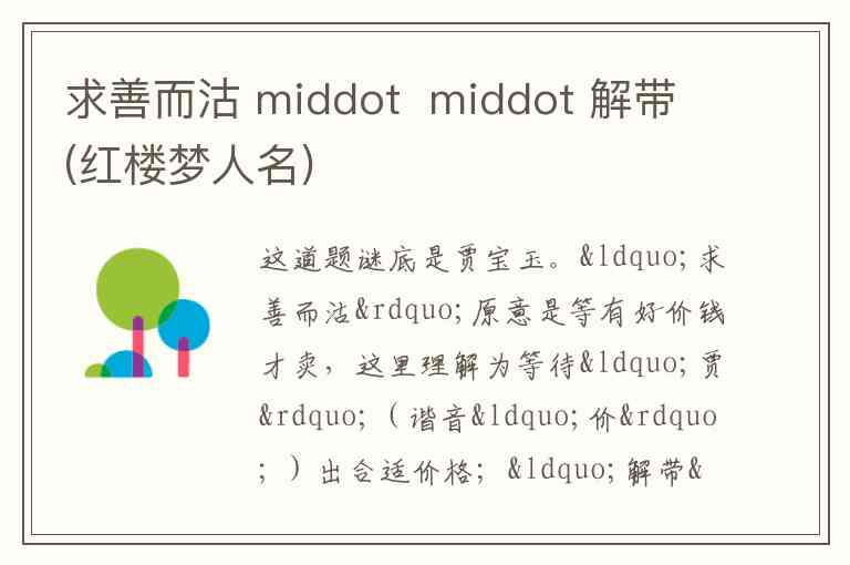 “求善而沽”原意是等有好价钱才卖,这里理解为等待“贾”(谐音“价” )出合适价格;“解带”形象地把“宝”字拆分开来想象(宝盖头好似衣带解开的样子 );整体扣合“贾宝玉”这个名字 。
