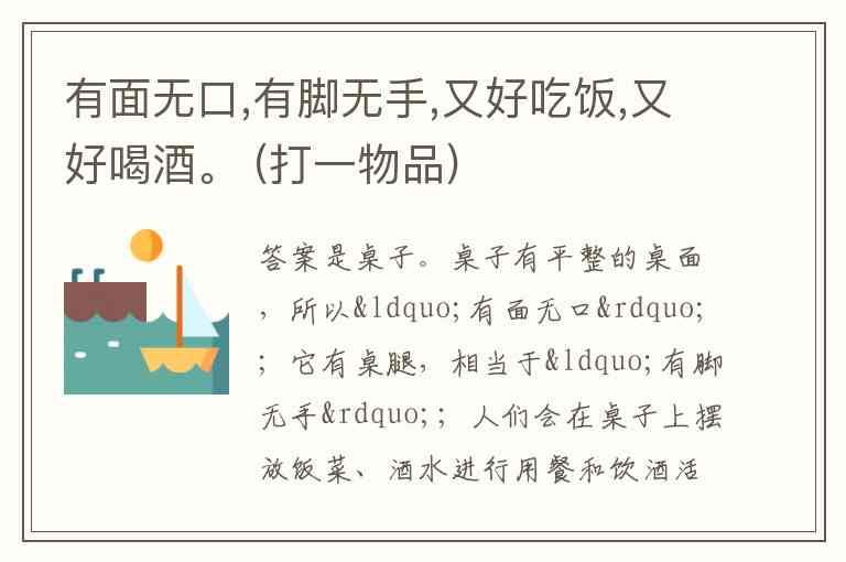 桌子有平整的桌面,所以“有面无口”;它有桌腿,相当于“有脚无手”;人们会在桌子上摆放饭菜、酒水进行用餐和饮酒活动,符合“又好吃饭,又好喝酒”的描述 。