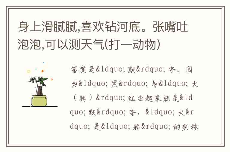 身上滑腻腻,喜欢钻河底。张嘴吐泡泡,可以测天气(打一动物)